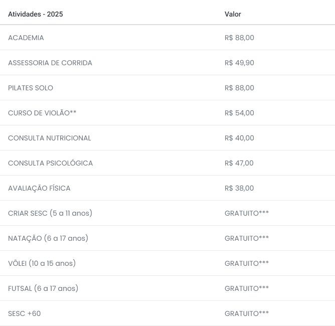 2. Acesso a diversos serviços com desconto especial, incluindo: academia e pilates, atendimento em Psicologia e Nutrição, cursos de música, escola de esportes (natação, vôlei, etc.), projeto Criar Sesc (acompanhamento pedagógico no contraturno escolar), Sesc +60 (atividades para terceira idade: bingo, bailes, oficinas);