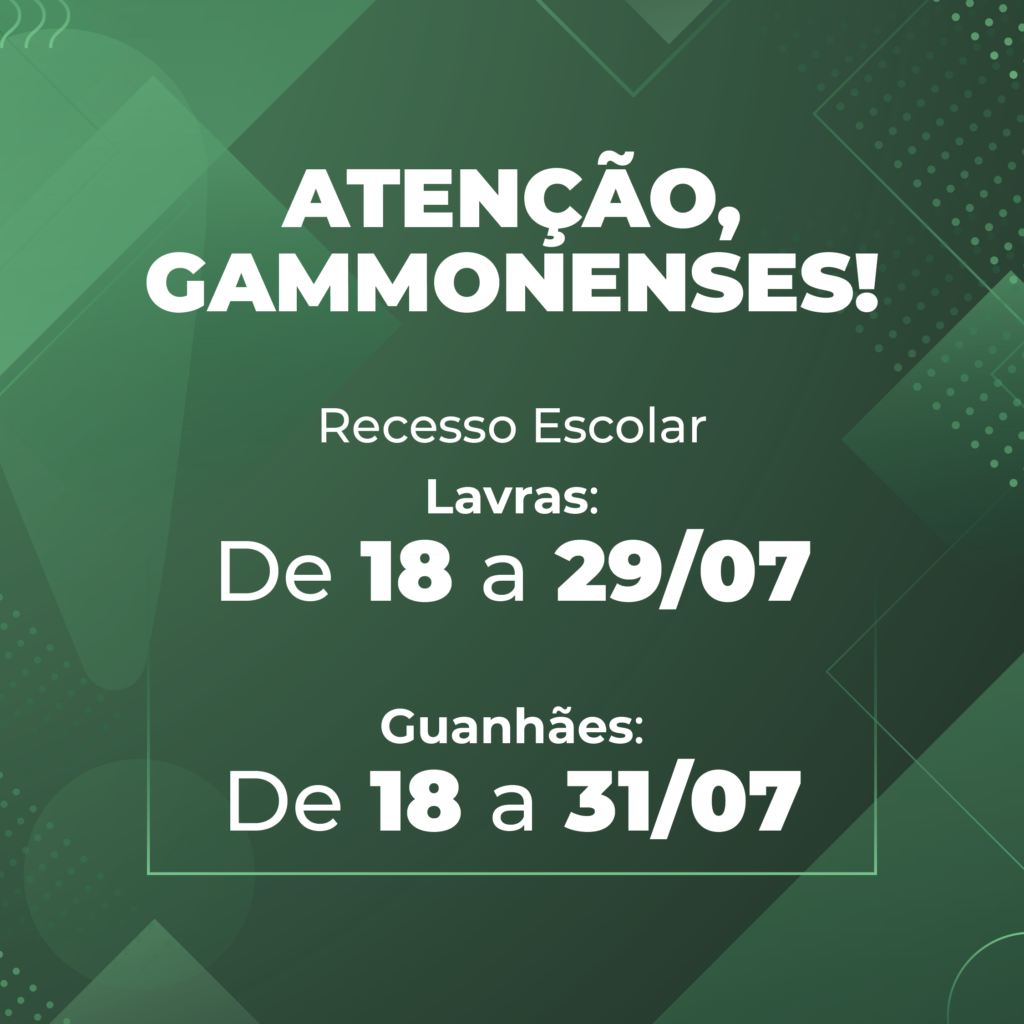 Nação Gammonense, as férias escolares do Instituto Presbiteriano Gammon acontecem entre os dias 18 e 29 de julho, na unidade de Lavras, e, em Guanhães, entre os dias 18 e 31 de julho. Desejamos que todos possam aproveitar para descansar e curtir com amigos e familiares. A nossa volta às aulas acontece dia 1 de agosto, segunda-feira. Bom descanso!